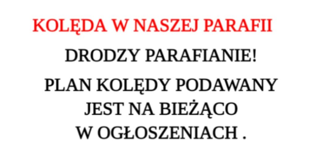 Plan kolędy jest podawany na bieżąco w ogłoszeniach. Kapłani będą zaczynali kolędę od poniedziałku do piątku od godziny 16.00, w soboty od godz. 12.00, a w niedzielę od godz. 16.00.