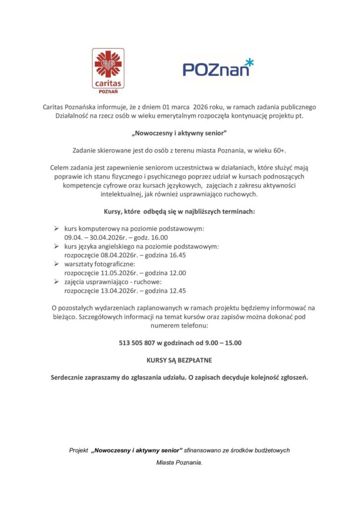 Koła Seniora u Świętego Jerzego z radością informuje, że Caritas Archidiecezji Poznańskiej rozpoczęła realizację kolejnej edycji projektu „Nowoczesny i aktywny senior”. Projekt skierowany jest do mieszkańców Poznania w wieku 60+ i ma na celu wspieranie aktywności, rozwoju oraz dobrego samopoczucia seniorów.